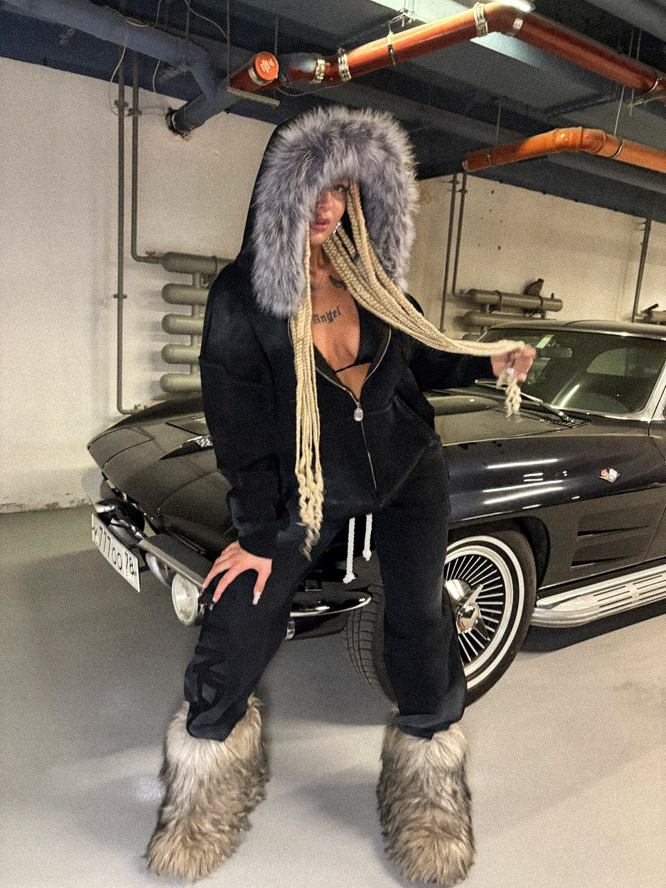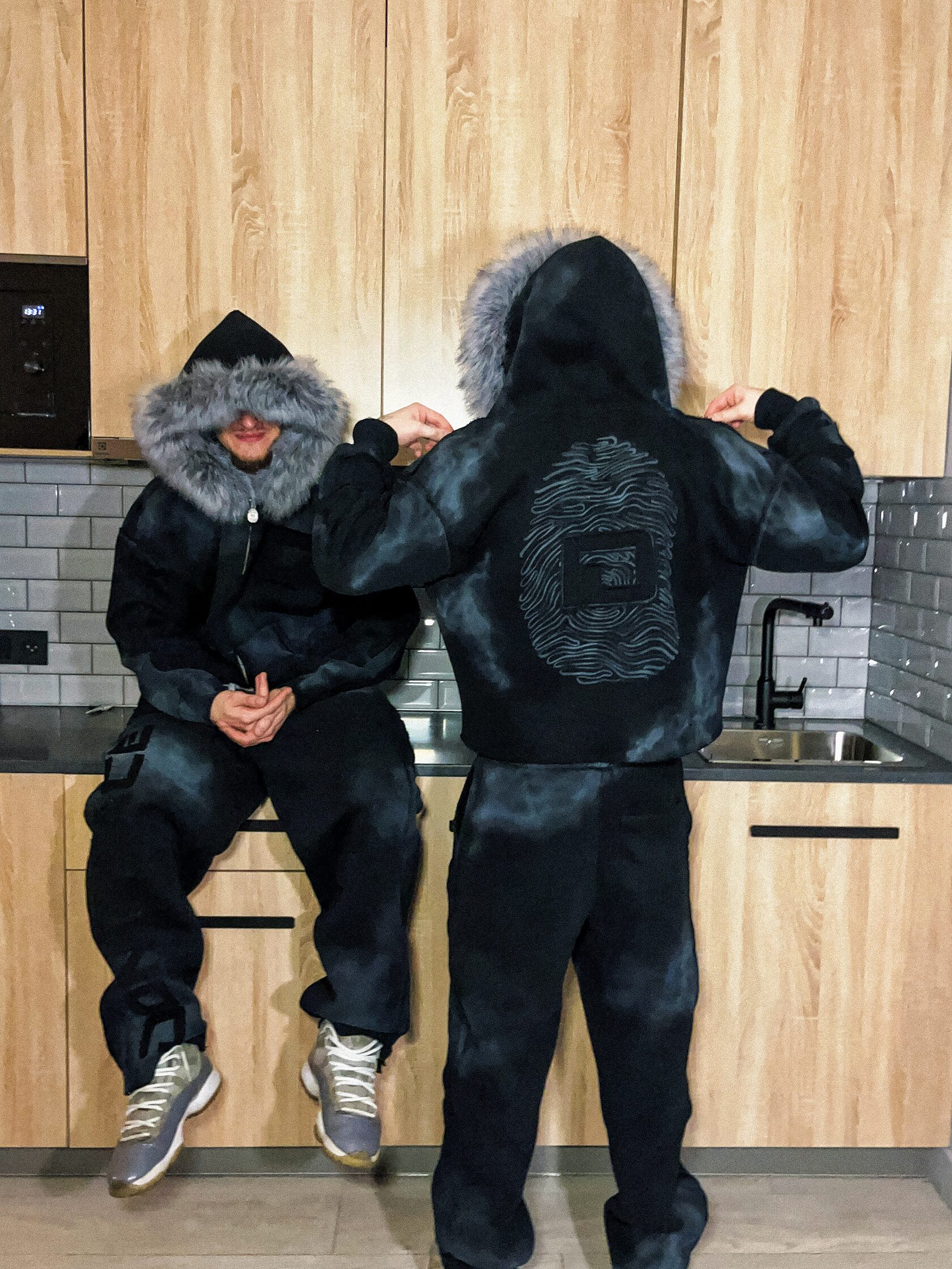 Унисекс-костюм из премиального велюрового футера — нового супер мягкого материала, который держит форму. Объемный меховой воротник. Полностью ручная работа: объемные тканевые буквы и черные стразы вручную нанесены на худи и на штаны. Авторский принт, объёмные детали, фирменный локкер на худи и молнии внизу брюк. Эстетика силы и точности — в каждом шве.